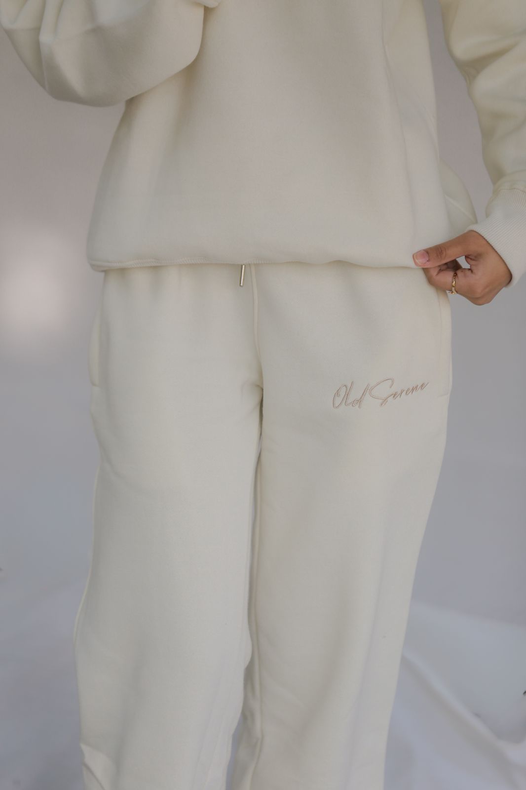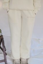 Designed for effortless comfort and timeless style, these ivory wide-leg trousers bring a soft, serene aesthetic to your everyday wardrobe. Crafted from premium fleece fabric, they offer a relaxed fit with a clean silhouette, perfect for lounging or elevated casual looks. Subtle embroidery detail adds a touch of minimal elegance, making them a staple for cozy yet refined outfits.